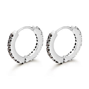 Unisex small hoop earrings in 9kt recycled white gold, set with black diamonds.