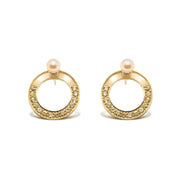 Pair of earrings in yellow gold, set with yellow sapphires pave and a lustrous golden pearl stud, for an edgy but feminine everyday piece. The design is inspired by the African tribes' traditional earplugs in stretched lobe, all made refined and sophisticated.